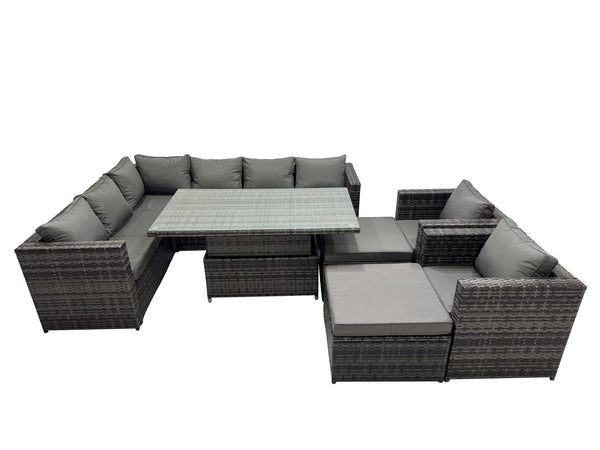 This Modern deluxe rising dining table set is best for multiple occasion. The Rattan set is strong durability which lasts for a long time,it also has strong tempered table top glass. Cushions are included and are fitted to the shape of the sofa and chairs for comfort. This wonderful product will help you showcase any garden,patio or conservatory.