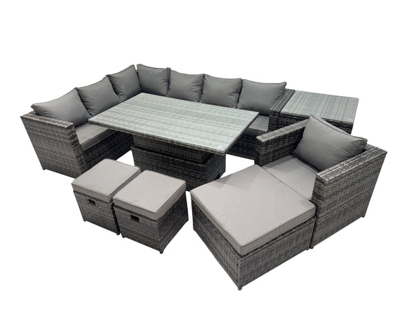 This Modern deluxe rising dining table set is best for multiple occasion. The Rattan set is strong durability which lasts for a long time,it also has strong tempered table top glass. Cushions are included and are fitted to the shape of the sofa and chairs for comfort. This wonderful product will help you showcase any garden,patio or conservatory.