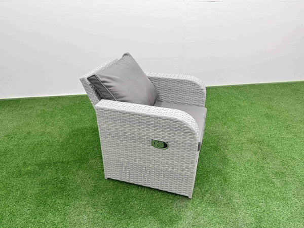 Light grey rattan with dark grey fabric.Color may vary due to light or monitor.we are unable to return the item due to this problem.Please contact us before purchase if you have requirements on color saturation.The 2 armchairs are adjustable,you can adjust the inclination of the chair back from 90¡ã-130¡ã through the button.