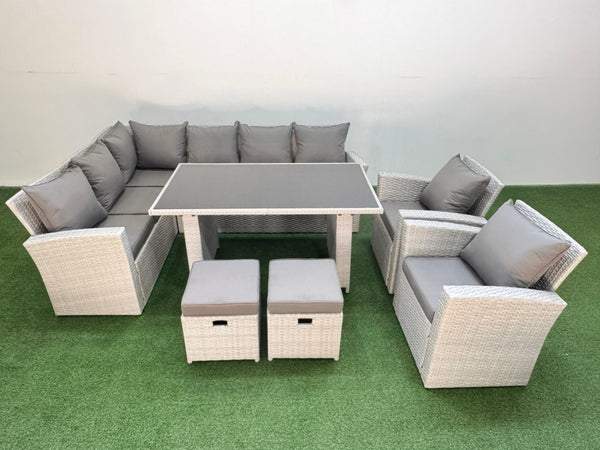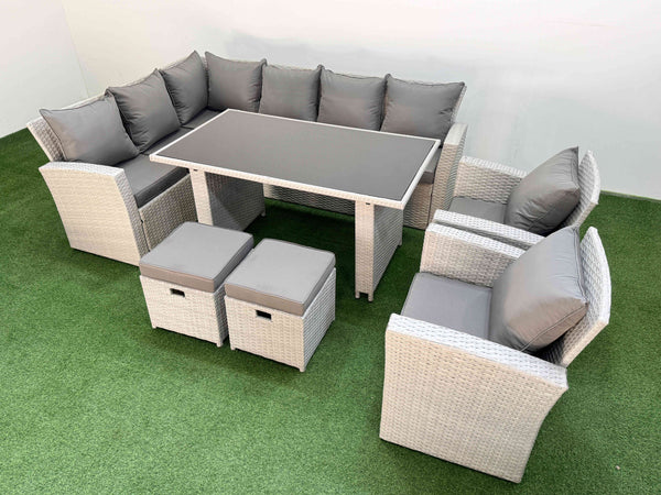 This classic corner sofa can accommodate 8 peoples and has a comfortable and soft cushion back,made of new premium dark grey rattan that will withstand British weather.