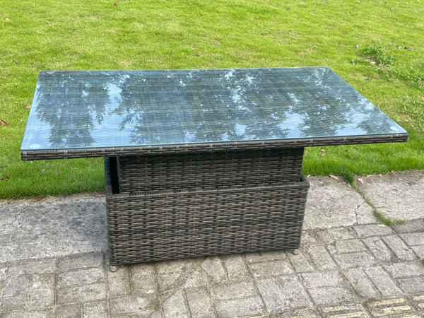 This Modern deluxe rattan sofa rising dining table set is best for multiple occasion.The Rattan set is strong durability which lasts for a long time,it also has strong tampered table top glass.Cushions are included and are fitted to the shape of the sofa and chairs for comfort.This wonderful product will help you showcase any garden,patio or conservatory.