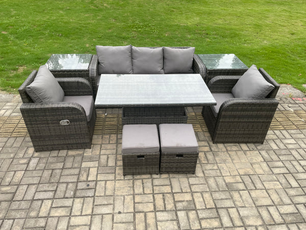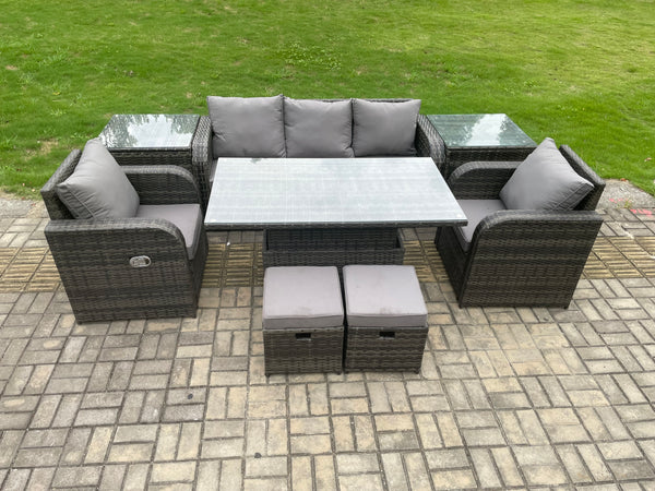 This deluxe 7 Seater rattan sofa rising dining table set is a great addition to patio or garden,made of high quality PE rattan and durable galvanized steel construction for sturdiness and long lasting.Durability,and can be put outdoor all year round.
